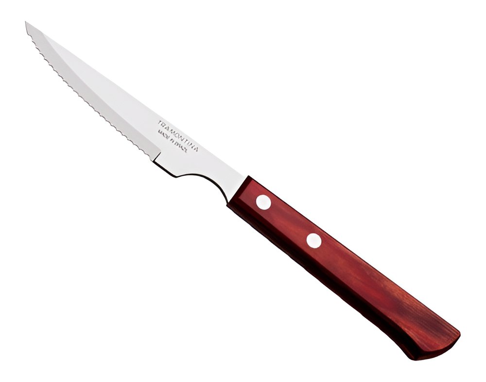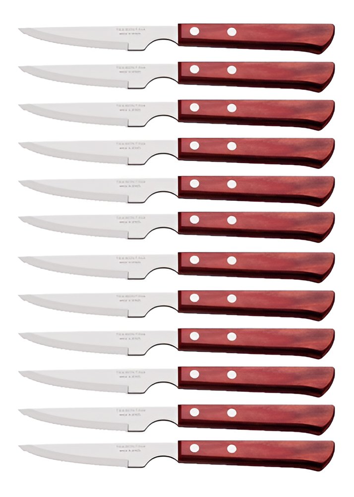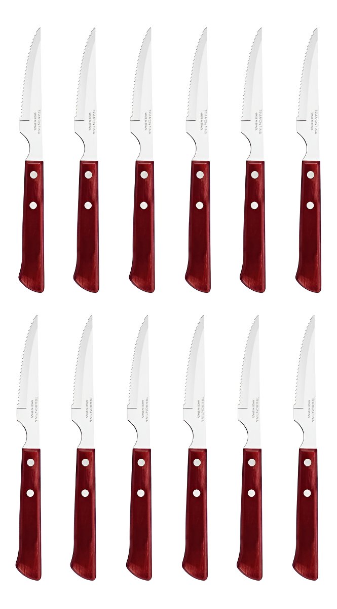 Este set de cuchillos chuleteros Churrasco Polywood de la reconocida marca Tramontina es el complemento perfecto para cualquier cocina. Compuesto por 12 piezas, cada cuchillo cuenta con una lámina de acero inoxidable de alta calidad, garantizando durabilidad y resistencia al uso constante. El modelo 21109/074 se distingue por su mango de madera tratada Polywood, un material resistente y de larga duración que aporta un toque de elegancia y sofisticación a cada pieza. El color rojo del mango añade un toque de color y personalidad a estos utensilios, haciéndolos destacar en cualquier ambiente. Los remaches de aluminio aseguran la unión perfecta entre la hoja y el mango, proporcionando un manejo seguro y cómodo. Estos cuchillos son ideales para cortar asados, chuletas y churrascos, convirtiéndolos en una herramienta esencial para los amantes de la carne. Su diseño y funcionalidad los hacen aptos para cualquier tipo de cocina, desde la más tradicional hasta la más moderna.