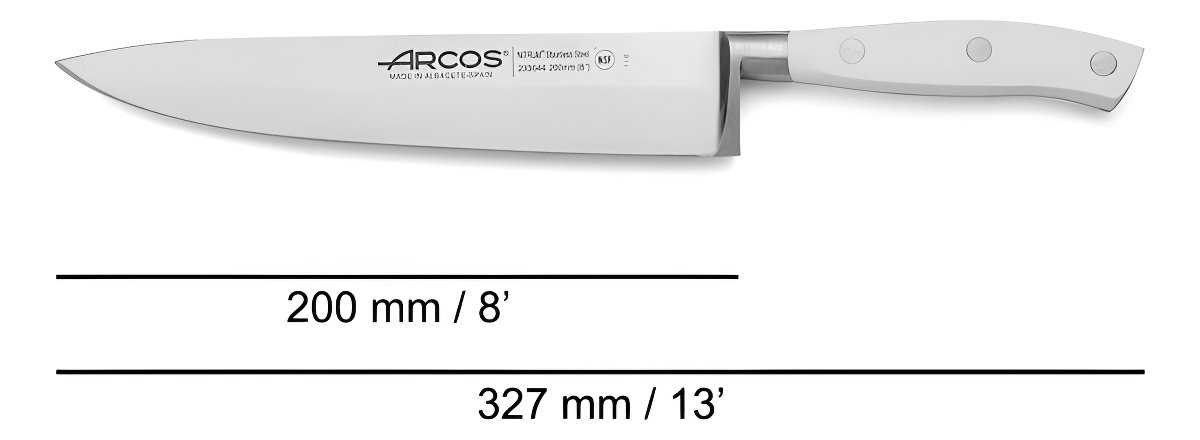 El cuchillo Cocinero Serie Riviera Blanc 200 mm está fabricado para ofrecer una mayor capacidad de corte. Gracias a su hoja ancha y estable forjada de acero inoxidable NITRUM® podrás tener una herramienta versátil para picar y trocear diversidad de carnes y verduras.
