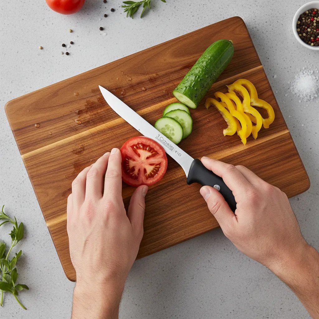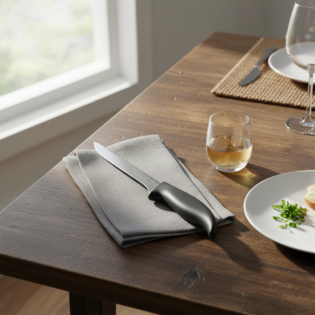 Con un espesor de 1 mm, este cuchillo es lo suficientemente robusto para enfrentar los desafíos de la cocina profesional y doméstica. Su longitud de 15 cm es perfecta para maniobras detalladas, asegurando que cada corte sea limpio y eficiente. Además, es apto para lavavajillas, lo que facilita su limpieza y mantenimiento.