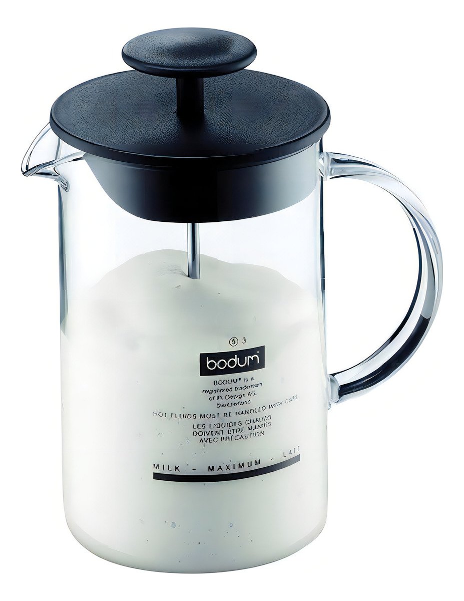 • La habitual elegancia y el gusto por los detalles de Bodum podemos comprobarla en el mango, que también es transparente y constituye en realidad una prolongación del cristal del recipiente. O en la boquilla con la forma adecuada para servir la espuma de leche sobre la taza directamente desde el recipiente.
