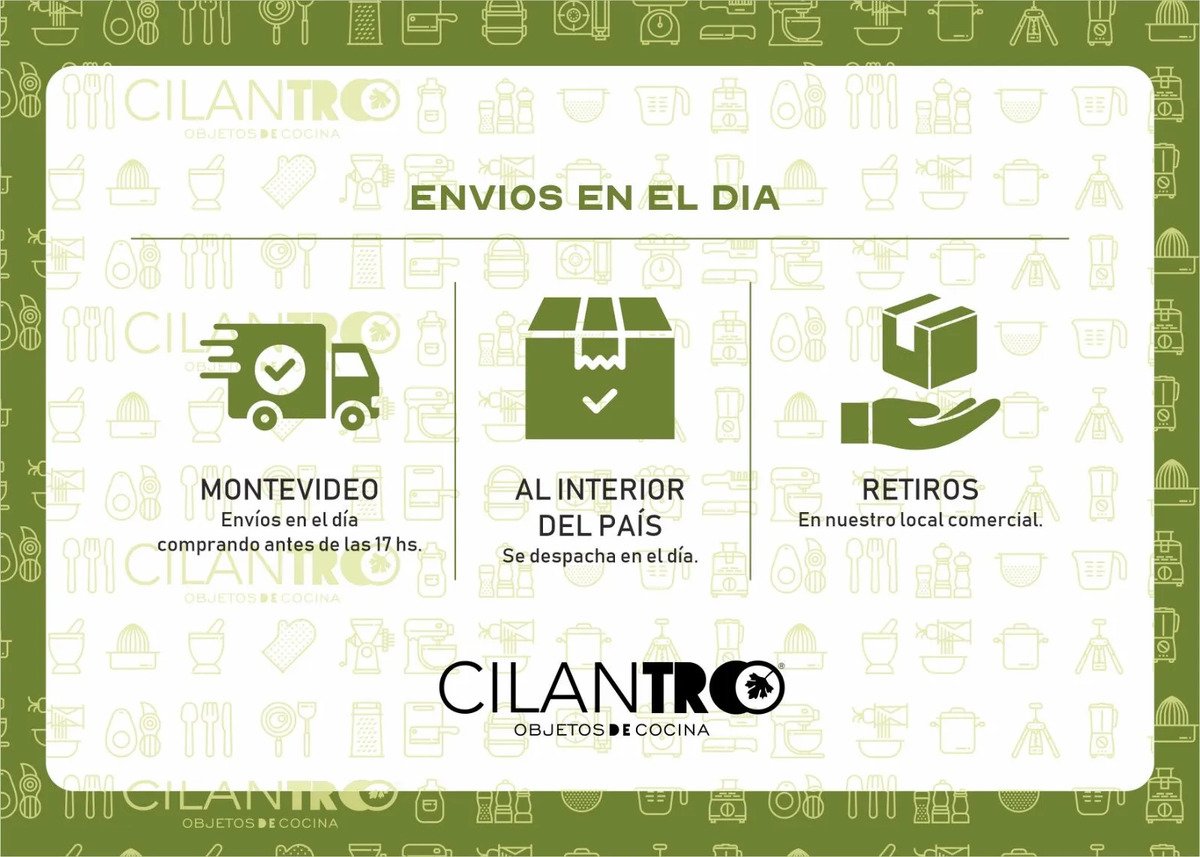 Cilantro Bazar es una compañía uruguaya dedicada a la comercialización de una amplia gama de productos gastronómicos en la ciudad de Montevideo. Con una trayectoria de 10 años en el mercado, se ha convertido en un referente para los amantes de la cocina y la buena comida. Tenemos pasión por la gastronomía, lo que nos llevó a estar involucrados en la industria hace décadas asesorando grandes chefs y restaurantes. En Cilantro Bazar, nuestros clientes pueden encontrar una amplia variedad de productos de calidad, cuidadosamente seleccionados para satisfacer las necesidades tanto de profesionales como de aficionados culinarios, desde una gran variedad de productos de vajilla hasta utensilios de cocina y accesorios, ofrecemos todo lo necesario para equipar una cocina de alto nivel. Contamos, además, con un profundo conocimiento en gastronomía y estamos siempre dispuestos a brindar asesoramiento de primer nivel. Nuestro compromiso con la calidad y la excelencia se refleja en cada uno de nuestros productos, sumado a una sólida reputación y larga trayectoria, que hacen que Cilantro Bazar se haya convertido en un lugar de referencia. PREGUNTAS FRECUENTES – CILANTROBAZAR • ¿Dónde se encuentran ubicados? Zona Centro (IMM) • ¿Cuál es su horario de atención? CENTRO (IMM) de Lunes a Viernes de 9 a 18 horas . Sábados de 9 a 14 horas • ¿Cuáles son los métodos de pago? Mercado Pago: Oca, Visa, Mastercard, Lider o Diners Club International. Efectivo en Redes de Cobranza: Abitab o Red Pagos. Depósito Bancario: SANTANDER Efectivo, débito y crédito al momento de retirar en nuestro local o en domicilio. • ¿Hacen envíos? Válido para Montevideo e interior del país. Interior del Pais se despacha en Agencia de preferencia. En caso de utilizar Mercado Envíos es imprescindible verificar que los datos de envío sean correctos para una ágil entrega del producto. • ¿Los precios incluyen IVA? Todos los precios indicados son IVA incluido. Los envíos se coordinan exclusivamente por Mensaje Privado dentro de Mercado Libre.
