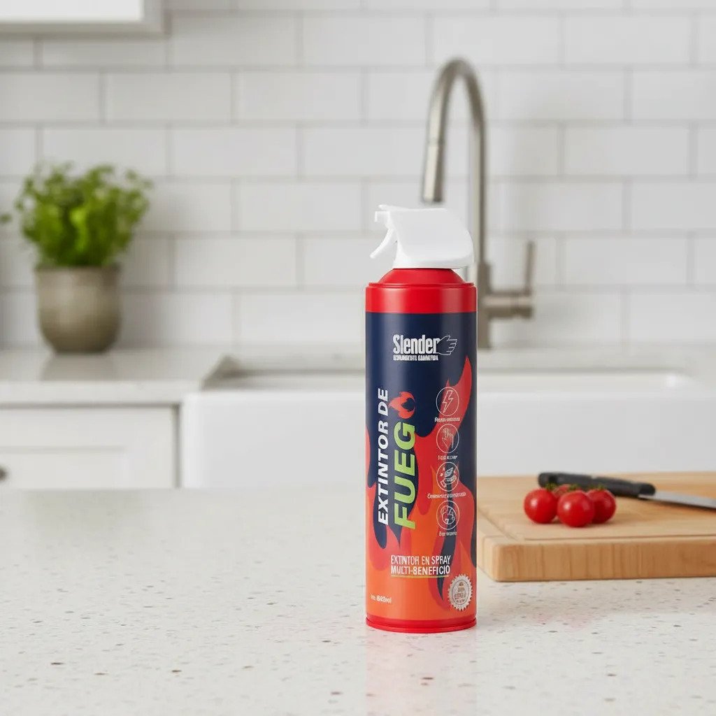 Extintor portátil en formato spray, ideal para una respuesta rápida y efectiva ante incendios domésticos o pequeños focos de fuego. Su diseño compacto permite guardarlo fácilmente y tenerlo siempre a mano en el hogar, la cocina o el vehículo.