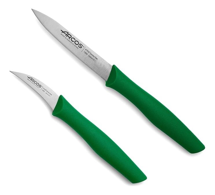 El set contiene un cuchillo mondador de 60 mm con hoja curva, y uno de 100 mm con hoja estrecha y puntiaguda. Ambos te proporcionarán gran precisión al cortar las frutas y verduras en la mesa.