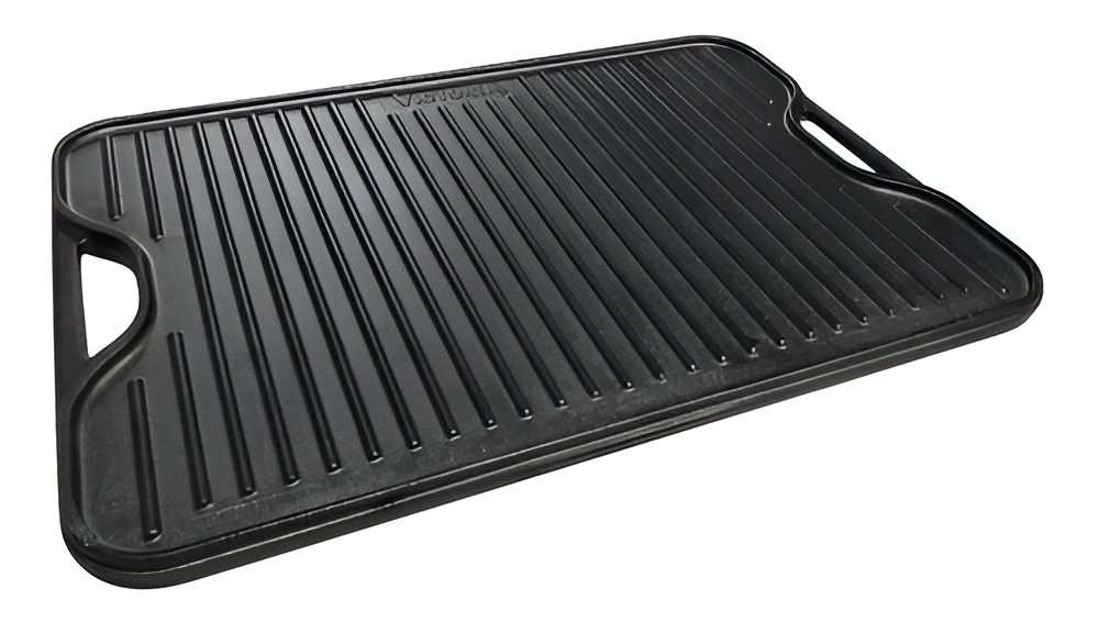 Fabricada en hierro fundido, la plancha también cuenta con una superficie acanalada que permite un drenaje eficaz de las grasas, ofreciendo platos más saludables sin sacrificar el sabor. El peso de 7.4 kg proporciona estabilidad sobre la cocina o la parrilla, asegurando que no se mueva durante el uso.