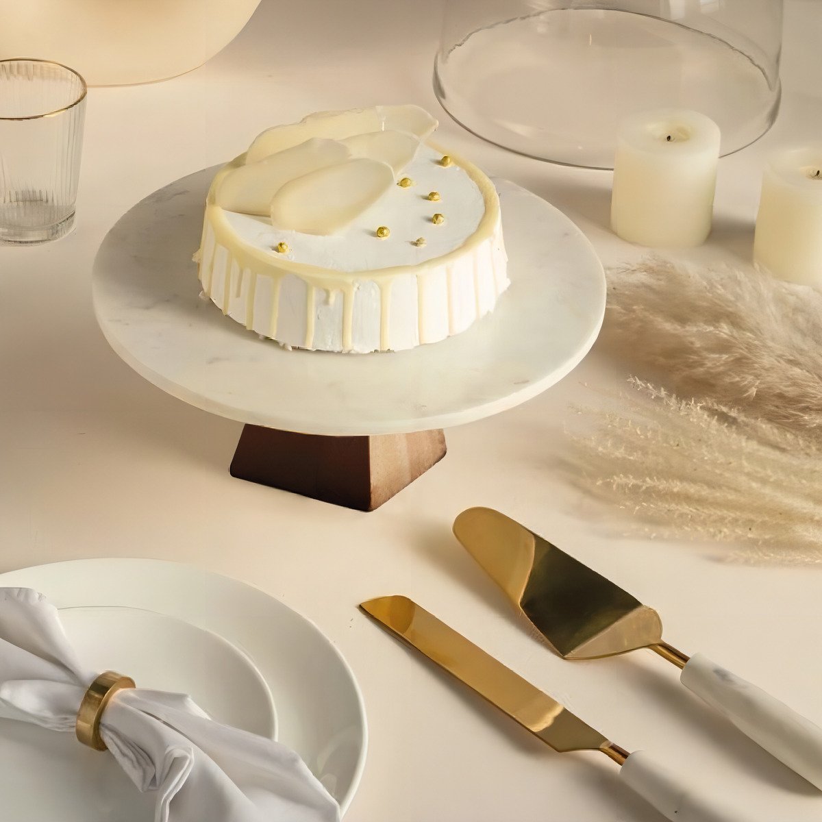 Fabricado en mármol blanco, este plato no solo es elegante, sino también duradero y fácil de limpiar, lo que lo convierte en una opción práctica para los amantes de la pastelería. Su base de bamboo proporciona un soporte robusto y atractivo, complementando la estética del mármol.