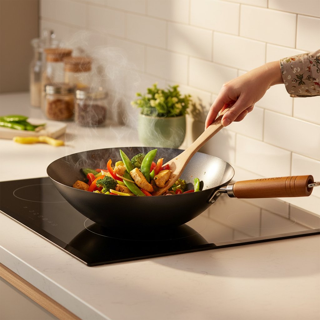 Wok hecho de acero al carbono de 1,4 mm que ofrece una excelente conducción de calor.