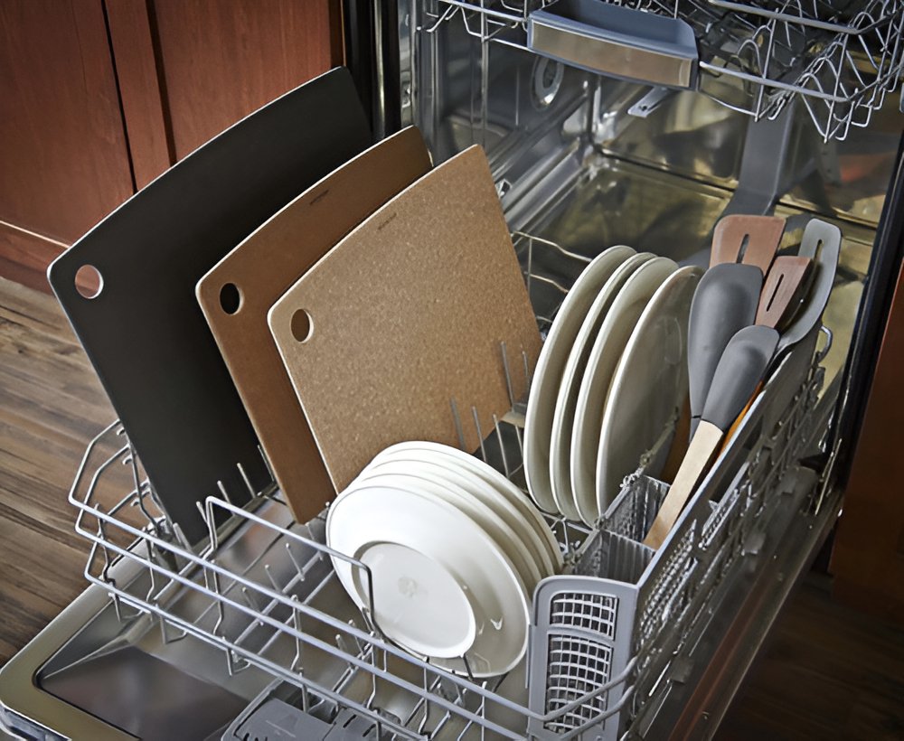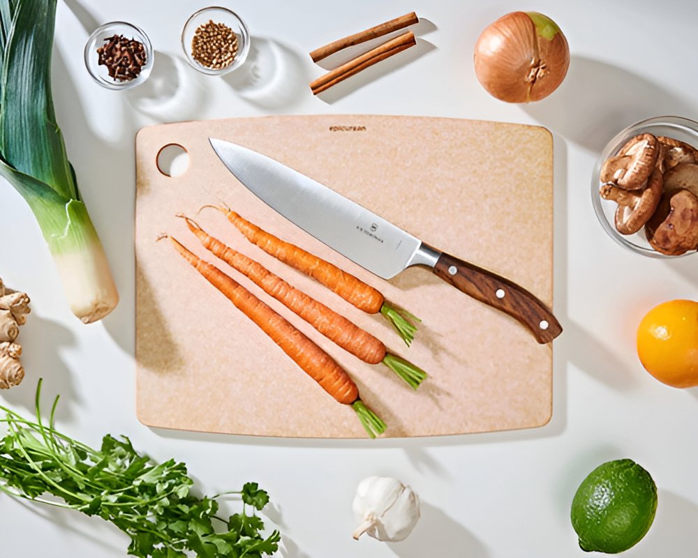 Richlite es el material del que Epicurean fabrica sus productos. Cientos de hojas de papel empapadas en la resina segura para los alimentos se presionan juntas bajo presión y calor extremos, fusionando las hojas individuales en un trozo de material sólido. El producto final es excepcionalmente fuerte, pero mantiene el aspecto cálido y natural de la madera. Es ligero, no esporoso, apto para cuchillos y apto para lavavajillas. No se agrietará, se partirá ni manchará, lo que lo convierte en un material perfecto para tablas de cortar y ganar reconocimiento de productos epicúreos en todo el mundo.